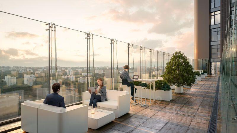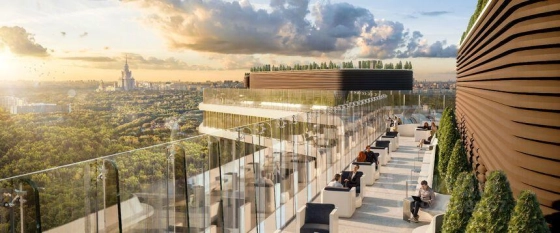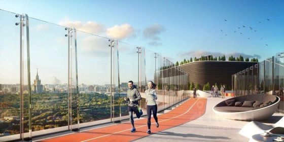 Инфраструктура дома включает в себя детские клубы в каждой секции, sky-мосты между секциями и уникальный sky-парк на крышах - с обзорной площадкой. Из дома открываются потрясающие виды на парк "Событие", МГУ, Сити, Поклонную гору и запад Москвы.