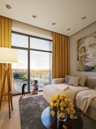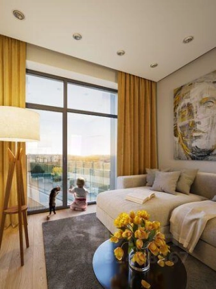 Продается 1-комн. квартира в ЖК "Событие" на 21-м этаже. Общая площадь лота составляет 46.20 кв. м, из которых 18.50 кв. м отведено под просторную кухню-гостиную. 1 совмещенный санузел.