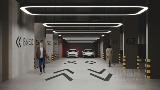 В доме трехуровневый подземный паркинг на 728 м/м с возможностью установки зарядных устройств для электромобилей, мойкой колес и кладовыми помещениями. Прямой лифт идет из паркинга на любой этаж.